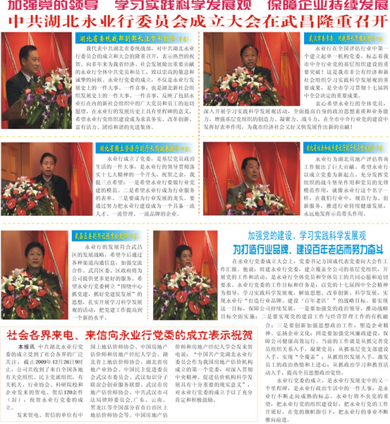 2009年12月26日,中國共產黨湖北永業行委員會成立大會在武昌隆重召開。湖北永業行黨委副書記、總裁潘世炳主持本次會議,中國土地估價師協會副會長秦海榮專程赴武漢致賀,大會在莊嚴的國歌聲中開幕。