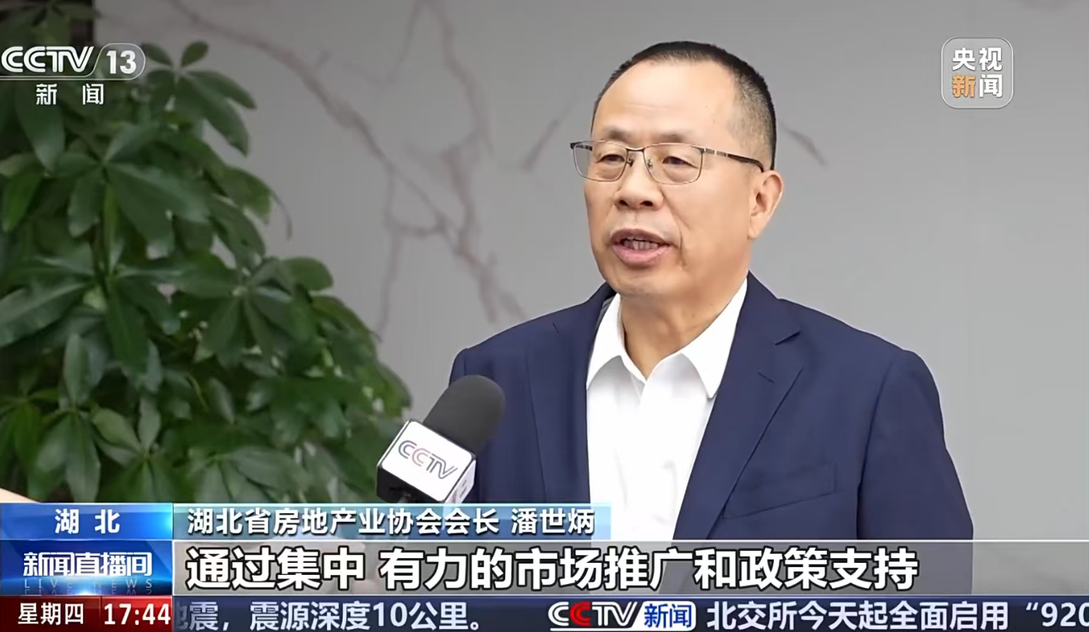 2025年10月9日,中央電視臺《新聞直播間》欄目播出“湖北多地舉行房交會 樓市呈企穩(wěn)回升勢頭”報道,湖北省房地產(chǎn)業(yè)協(xié)會會長、永業(yè)行董事長潘世炳接受央視記者采訪。